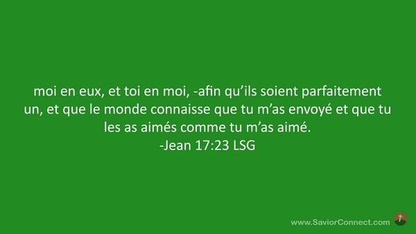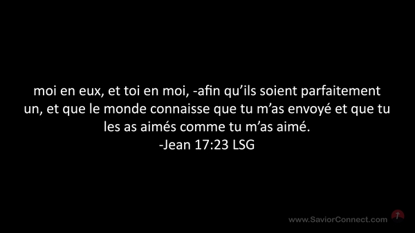 moi en eux, et toi en moi, -afin qu'ils soient parfaitement un, et que le monde connaisse que tu m'as envoyé et que tu les as aimés comme tu m'as aimé. -Jean 17:23 LSG