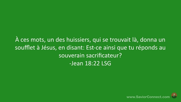 À ces mots, un des huissiers, qui se trouvait là, donna un soufflet à Jésus, en disant: Est-ce ainsi que tu réponds au souverain sacrificateur? -Jean 18:22 LSG