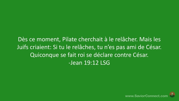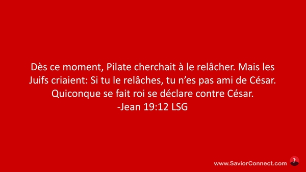 Dès ce moment, Pilate cherchait à le relâcher. Mais les Juifs criaient: Si tu le relâches, tu n'es pas ami de César. Quiconque se fait roi se déclare contre César. -Jean 19:12 LSG