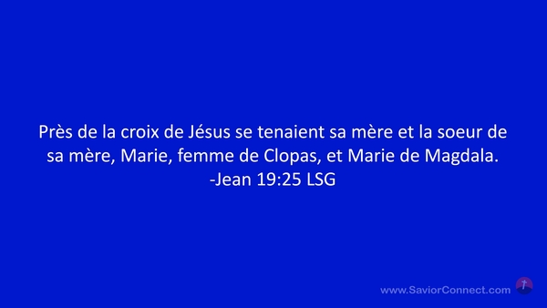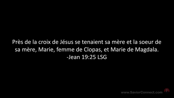 Près de la croix de Jésus se tenaient sa mère et la soeur de sa mère, Marie, femme de Clopas, et Marie de Magdala. -Jean 19:25 LSG