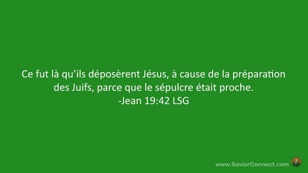Ce fut là qu'ils déposèrent Jésus, à cause de la préparation des Juifs, parce que le sépulcre était proche. -Jean 19:42 LSG