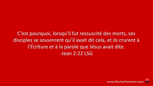C'est pourquoi, lorsqu'il fut ressuscité des morts, ses disciples se souvinrent qu'il avait dit cela, et ils crurent à l'Écriture et à la parole que Jésus avait dite. -Jean 2:22 LSG