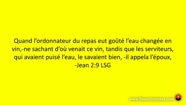 Quand l'ordonnateur du repas eut goûté l'eau changée en vin,-ne sachant d'où venait ce vin, tandis que les serviteurs, qui avaient puisé l'eau, le savaient bien, -il appela l'époux, -Jean 2:9 LSG