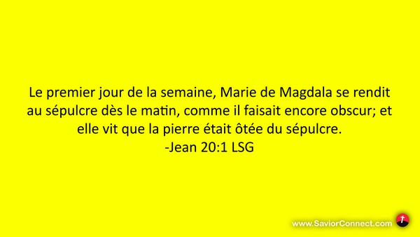 Le premier jour de la semaine, Marie de Magdala se rendit au sépulcre dès le matin, comme il faisait encore obscur; et elle vit que la pierre était ôtée du sépulcre. -Jean 20:1 LSG