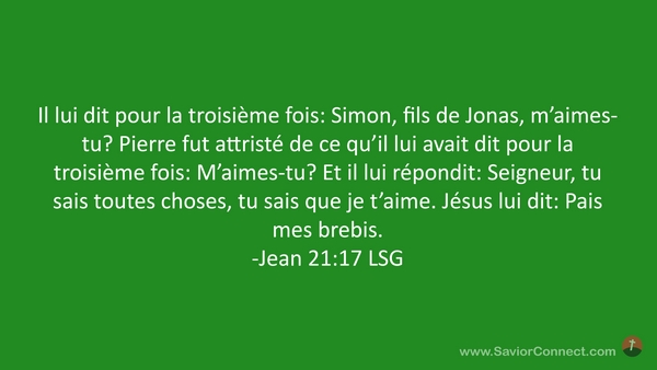 Il lui dit pour la troisième fois: Simon, fils de Jonas, m'aimes-tu? Pierre fut attristé de ce qu'il lui avait dit pour la troisième fois: M'aimes-tu? Et il lui répondit: Seigneur, tu sais toutes choses, tu sais que je t'aime. Jésus lui dit: Pais mes brebis. -Jean 21:17 LSG