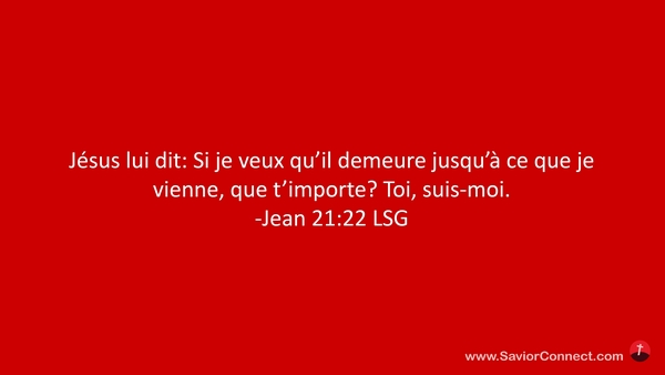 Jésus lui dit: Si je veux qu'il demeure jusqu'à ce que je vienne, que t'importe? Toi, suis-moi. -Jean 21:22 LSG