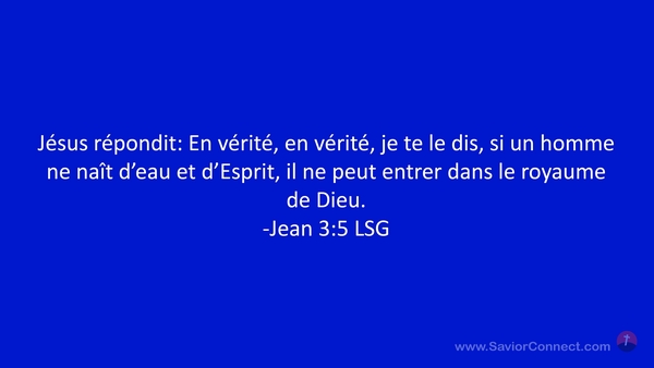 Jésus répondit: En vérité, en vérité, je te le dis, si un homme ne naît d'eau et d'Esprit, il ne peut entrer dans le royaume de Dieu. -Jean 3:5 LSG