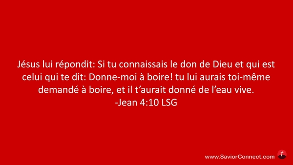 Jésus lui répondit: Si tu connaissais le don de Dieu et qui est celui qui te dit: Donne-moi à boire! tu lui aurais toi-même demandé à boire, et il t'aurait donné de l'eau vive. -Jean 4:10 LSG