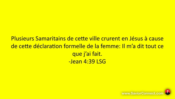 Plusieurs Samaritains de cette ville crurent en Jésus à cause de cette déclaration formelle de la femme: Il m'a dit tout ce que j'ai fait. -Jean 4:39 LSG