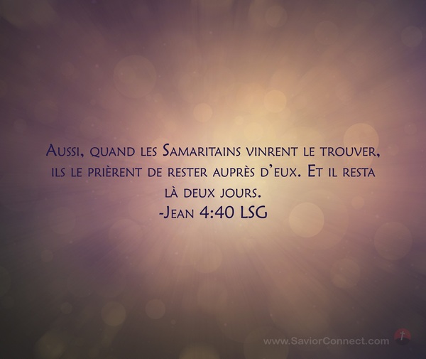 Aussi, quand les Samaritains vinrent le trouver, ils le prièrent de rester auprès d'eux. Et il resta là deux jours. -Jean 4:40 LSG
