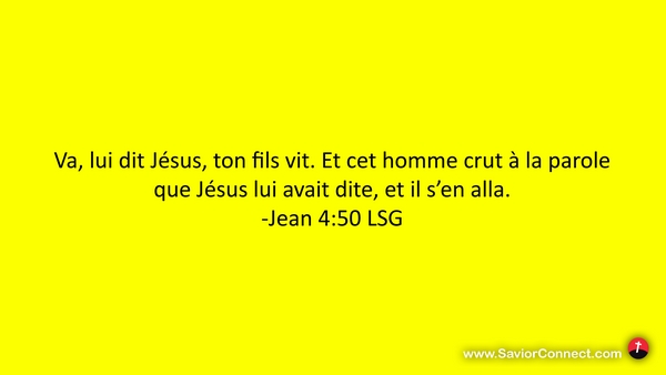 Va, lui dit Jésus, ton fils vit. Et cet homme crut à la parole que Jésus lui avait dite, et il s'en alla. -Jean 4:50 LSG