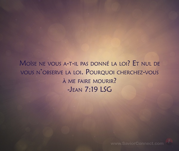 Moïse ne vous a-t-il pas donné la loi? Et nul de vous n'observe la loi. Pourquoi cherchez-vous à me faire mourir? -Jean 7:19 LSG