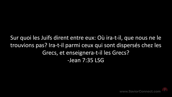 Sur quoi les Juifs dirent entre eux: Où ira-t-il, que nous ne le trouvions pas? Ira-t-il parmi ceux qui sont dispersés chez les Grecs, et enseignera-t-il les Grecs? -Jean 7:35 LSG