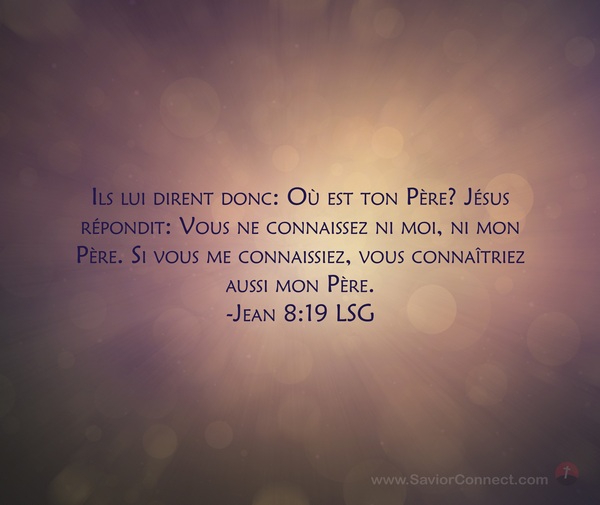 Ils lui dirent donc: Où est ton Père? Jésus répondit: Vous ne connaissez ni moi, ni mon Père. Si vous me connaissiez, vous connaîtriez aussi mon Père. -Jean 8:19 LSG