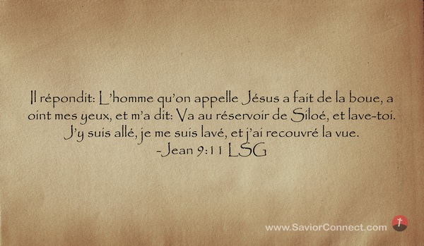 Il répondit: L'homme qu'on appelle Jésus a fait de la boue, a oint mes yeux, et m'a dit: Va au réservoir de Siloé, et lave-toi. J'y suis allé, je me suis lavé, et j'ai recouvré la vue. -Jean 9:11 LSG