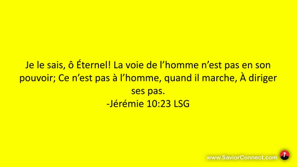 Je le sais, ô Éternel! La voie de l'homme n'est pas en son pouvoir; Ce n'est pas à l'homme, quand il marche, À diriger ses pas. -Jérémie 10:23 LSG