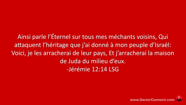 Ainsi parle l'Éternel sur tous mes méchants voisins, Qui attaquent l'héritage que j'ai donné à mon peuple d'Israël: Voici, je les arracherai de leur pays, Et j'arracherai la maison de Juda du milieu d'eux. -Jérémie 12:14 LSG