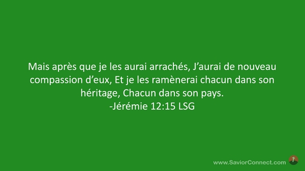 Mais après que je les aurai arrachés, J'aurai de nouveau compassion d'eux, Et je les ramènerai chacun dans son héritage, Chacun dans son pays. -Jérémie 12:15 LSG