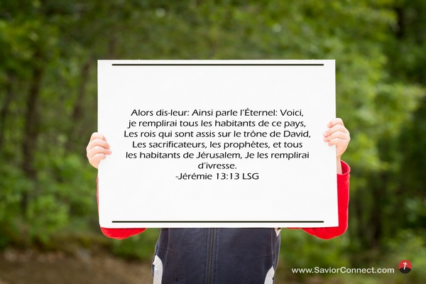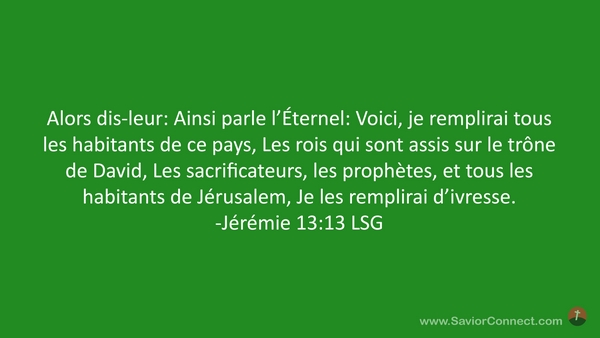Alors dis-leur: Ainsi parle l'Éternel: Voici, je remplirai tous les habitants de ce pays, Les rois qui sont assis sur le trône de David, Les sacrificateurs, les prophètes, et tous les habitants de Jérusalem, Je les remplirai d'ivresse. -Jérémie 13:13 LSG