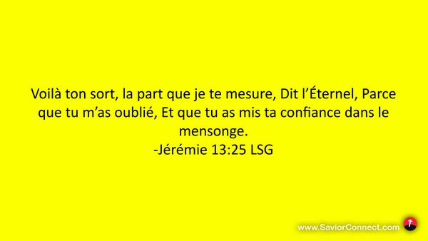 Voilà ton sort, la part que je te mesure, Dit l'Éternel, Parce que tu m'as oublié, Et que tu as mis ta confiance dans le mensonge. -Jérémie 13:25 LSG