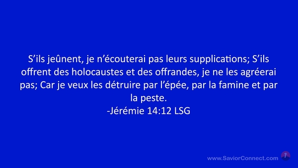 S'ils jeûnent, je n'écouterai pas leurs supplications; S'ils offrent des holocaustes et des offrandes, je ne les agréerai pas; Car je veux les détruire par l'épée, par la famine et par la peste. -Jérémie 14:12 LSG