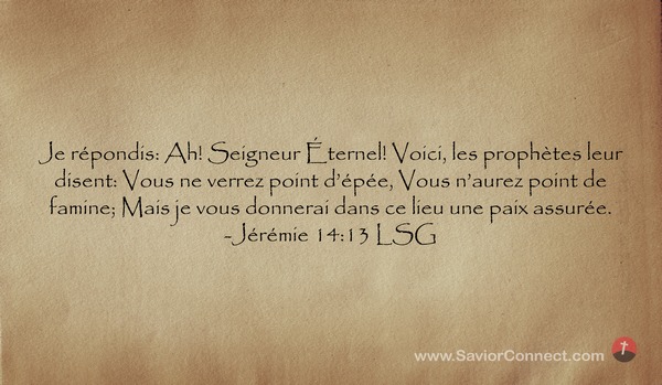 Je répondis: Ah! Seigneur Éternel! Voici, les prophètes leur disent: Vous ne verrez point d'épée, Vous n'aurez point de famine; Mais je vous donnerai dans ce lieu une paix assurée. -Jérémie 14:13 LSG