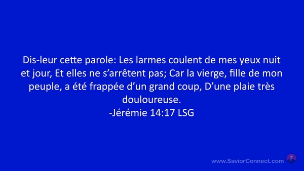 Dis-leur cette parole: Les larmes coulent de mes yeux nuit et jour, Et elles ne s'arrêtent pas; Car la vierge, fille de mon peuple, a été frappée d'un grand coup, D'une plaie très douloureuse. -Jérémie 14:17 LSG