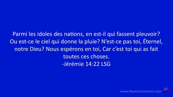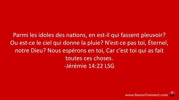 Parmi les idoles des nations, en est-il qui fassent pleuvoir? Ou est-ce le ciel qui donne la pluie? N'est-ce pas toi, Éternel, notre Dieu? Nous espérons en toi, Car c'est toi qui as fait toutes ces choses. -Jérémie 14:22 LSG