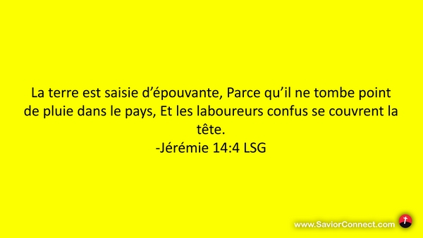 La terre est saisie d'épouvante, Parce qu'il ne tombe point de pluie dans le pays, Et les laboureurs confus se couvrent la tête. -Jérémie 14:4 LSG