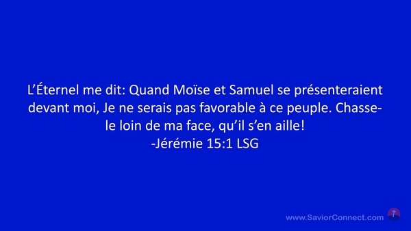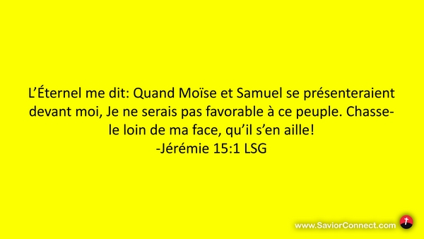 L'Éternel me dit: Quand Moïse et Samuel se présenteraient devant moi, Je ne serais pas favorable à ce peuple. Chasse-le loin de ma face, qu'il s'en aille! -Jérémie 15:1 LSG