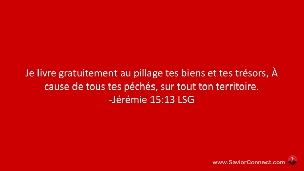 Je livre gratuitement au pillage tes biens et tes trésors, À cause de tous tes péchés, sur tout ton territoire. -Jérémie 15:13 LSG