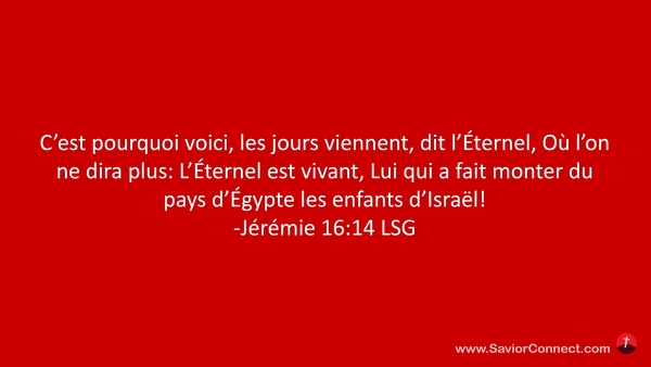 C'est pourquoi voici, les jours viennent, dit l'Éternel, Où l'on ne dira plus: L'Éternel est vivant, Lui qui a fait monter du pays d'Égypte les enfants d'Israël! -Jérémie 16:14 LSG