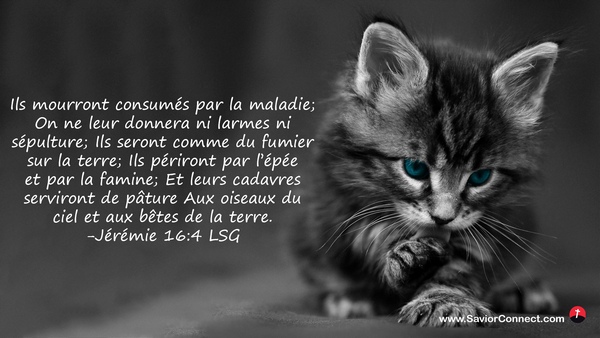 Ils mourront consumés par la maladie; On ne leur donnera ni larmes ni sépulture; Ils seront comme du fumier sur la terre; Ils périront par l'épée et par la famine; Et leurs cadavres serviront de pâture Aux oiseaux du ciel et aux bêtes de la terre. -Jérémie 16:4 LSG