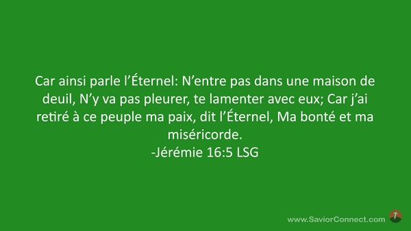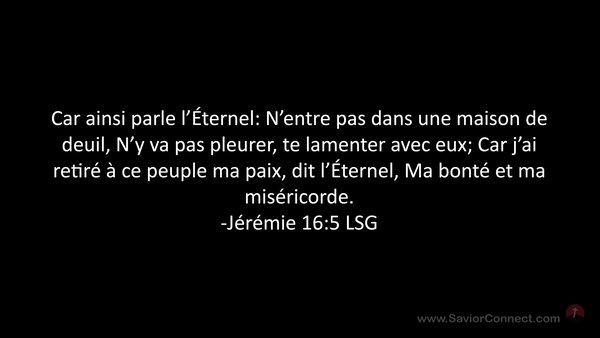 Car ainsi parle l'Éternel: N'entre pas dans une maison de deuil, N'y va pas pleurer, te lamenter avec eux; Car j'ai retiré à ce peuple ma paix, dit l'Éternel, Ma bonté et ma miséricorde. -Jérémie 16:5 LSG