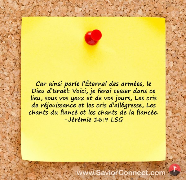 Car ainsi parle l'Éternel des armées, le Dieu d'Israël: Voici, je ferai cesser dans ce lieu, sous vos yeux et de vos jours, Les cris de réjouissance et les cris d'allégresse, Les chants du fiancé et les chants de la fiancée. -Jérémie 16:9 LSG