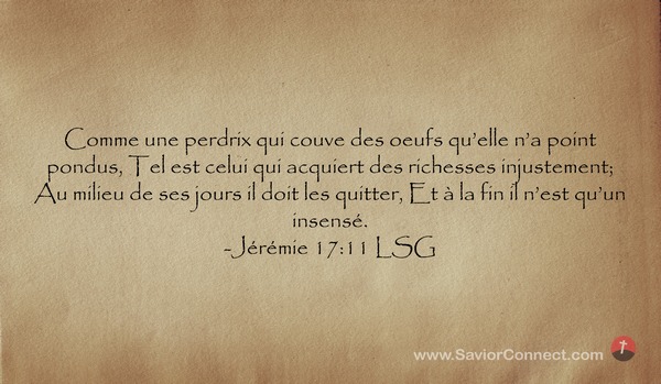 Comme une perdrix qui couve des oeufs qu'elle n'a point pondus, Tel est celui qui acquiert des richesses injustement; Au milieu de ses jours il doit les quitter, Et à la fin il n'est qu'un insensé. -Jérémie 17:11 LSG