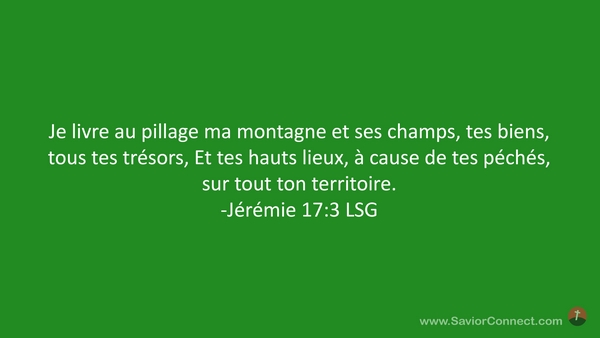 Je livre au pillage ma montagne et ses champs, tes biens, tous tes trésors, Et tes hauts lieux, à cause de tes péchés, sur tout ton territoire. -Jérémie 17:3 LSG