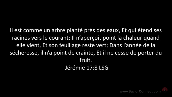 Il est comme un arbre planté près des eaux, Et qui étend ses racines vers le courant; Il n'aperçoit point la chaleur quand elle vient, Et son feuillage reste vert; Dans l'année de la sécheresse, il n'a point de crainte, Et il ne cesse de porter du fruit. -Jérémie 17:8 LSG