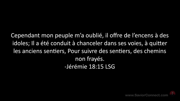 Cependant mon peuple m'a oublié, il offre de l'encens à des idoles; Il a été conduit à chanceler dans ses voies, à quitter les anciens sentiers, Pour suivre des sentiers, des chemins non frayés. -Jérémie 18:15 LSG