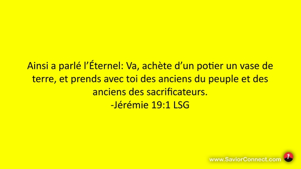 Ainsi a parlé l'Éternel: Va, achète d'un potier un vase de terre, et prends avec toi des anciens du peuple et des anciens des sacrificateurs. -Jérémie 19:1 LSG