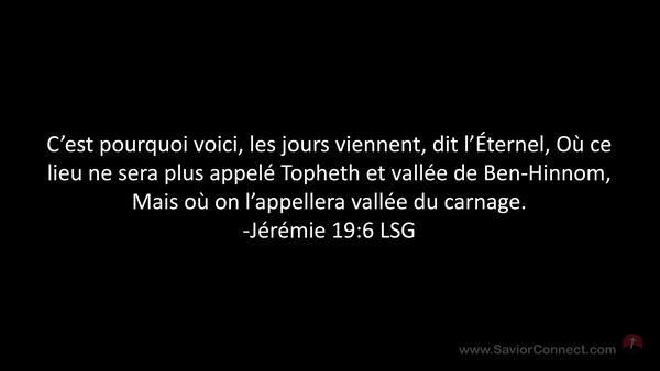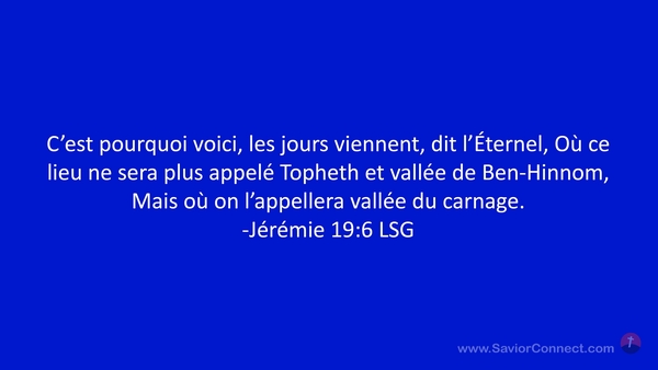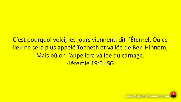C'est pourquoi voici, les jours viennent, dit l'Éternel, Où ce lieu ne sera plus appelé Topheth et vallée de Ben-Hinnom, Mais où on l'appellera vallée du carnage. -Jérémie 19:6 LSG