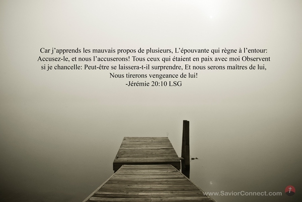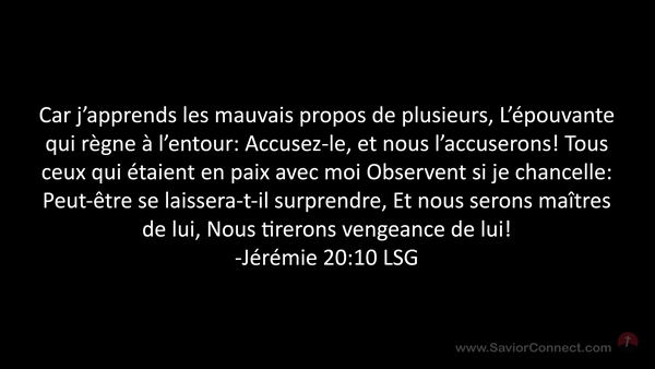 Car j'apprends les mauvais propos de plusieurs, L'épouvante qui règne à l'entour: Accusez-le, et nous l'accuserons! Tous ceux qui étaient en paix avec moi Observent si je chancelle: Peut-être se laissera-t-il surprendre, Et nous serons maîtres de lui, Nous tirerons vengeance de lui! -Jérémie 20:10 LSG