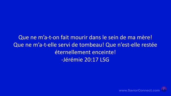 Que ne m'a-t-on fait mourir dans le sein de ma mère! Que ne m'a-t-elle servi de tombeau! Que n'est-elle restée éternellement enceinte! -Jérémie 20:17 LSG