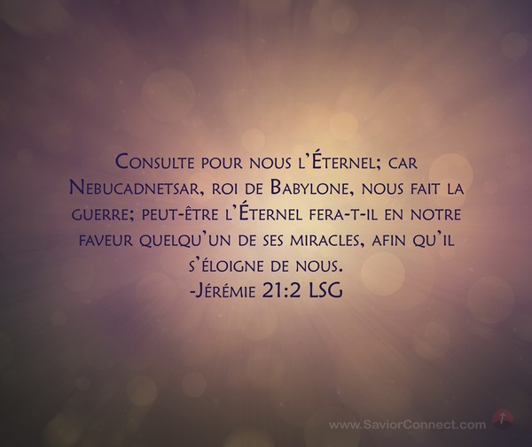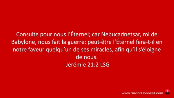 Consulte pour nous l'Éternel; car Nebucadnetsar, roi de Babylone, nous fait la guerre; peut-être l'Éternel fera-t-il en notre faveur quelqu'un de ses miracles, afin qu'il s'éloigne de nous. -Jérémie 21:2 LSG