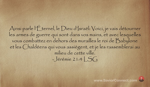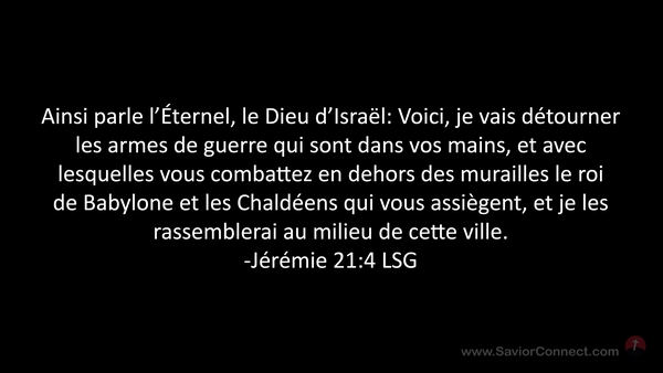 Ainsi parle l'Éternel, le Dieu d'Israël: Voici, je vais détourner les armes de guerre qui sont dans vos mains, et avec lesquelles vous combattez en dehors des murailles le roi de Babylone et les Chaldéens qui vous assiègent, et je les rassemblerai au milieu de cette ville. -Jérémie 21:4 LSG