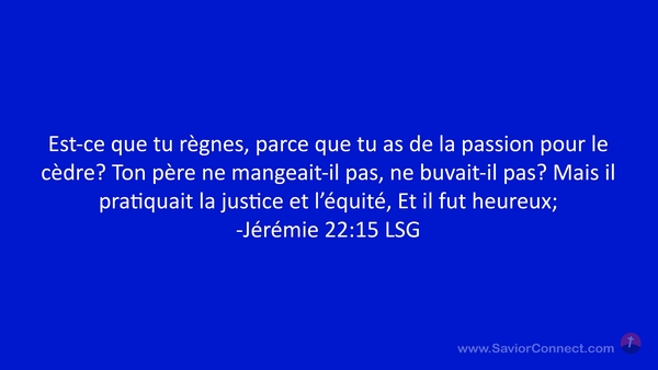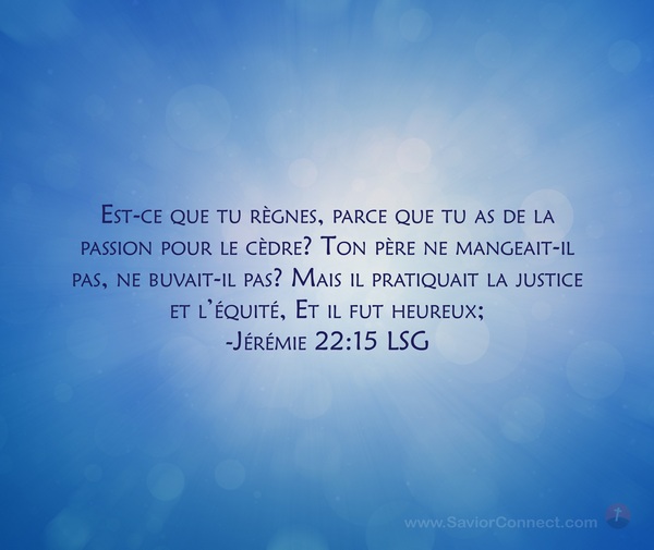 Est-ce que tu règnes, parce que tu as de la passion pour le cèdre? Ton père ne mangeait-il pas, ne buvait-il pas? Mais il pratiquait la justice et l'équité, Et il fut heureux; -Jérémie 22:15 LSG