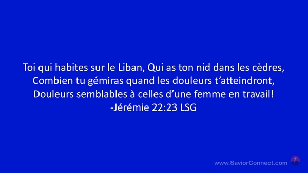 Toi qui habites sur le Liban, Qui as ton nid dans les cèdres, Combien tu gémiras quand les douleurs t'atteindront, Douleurs semblables à celles d'une femme en travail! -Jérémie 22:23 LSG