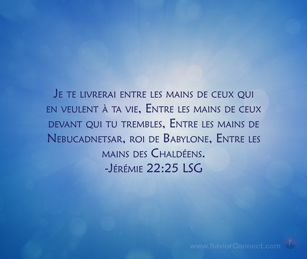 Je te livrerai entre les mains de ceux qui en veulent à ta vie, Entre les mains de ceux devant qui tu trembles, Entre les mains de Nebucadnetsar, roi de Babylone, Entre les mains des Chaldéens. -Jérémie 22:25 LSG