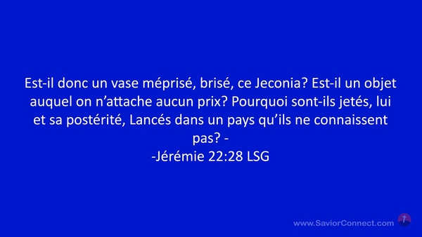 Est-il donc un vase méprisé, brisé, ce Jeconia? Est-il un objet auquel on n'attache aucun prix? Pourquoi sont-ils jetés, lui et sa postérité, Lancés dans un pays qu'ils ne connaissent pas? - -Jérémie 22:28 LSG
