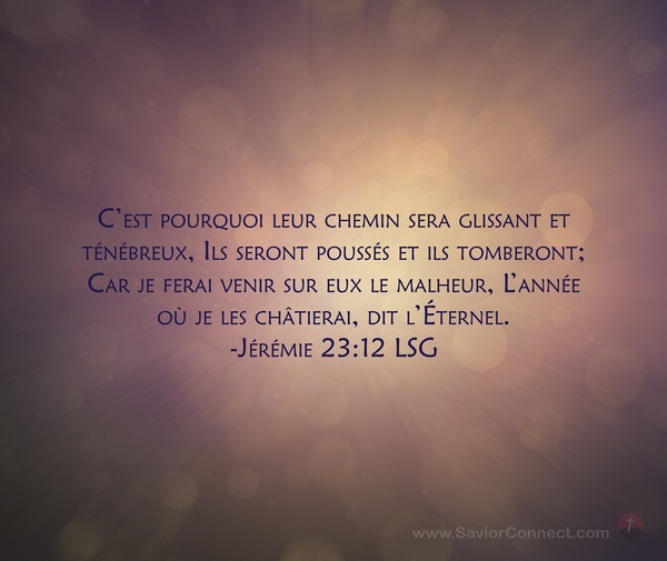 C'est pourquoi leur chemin sera glissant et ténébreux, Ils seront poussés et ils tomberont; Car je ferai venir sur eux le malheur, L'année où je les châtierai, dit l'Éternel. -Jérémie 23:12 LSG